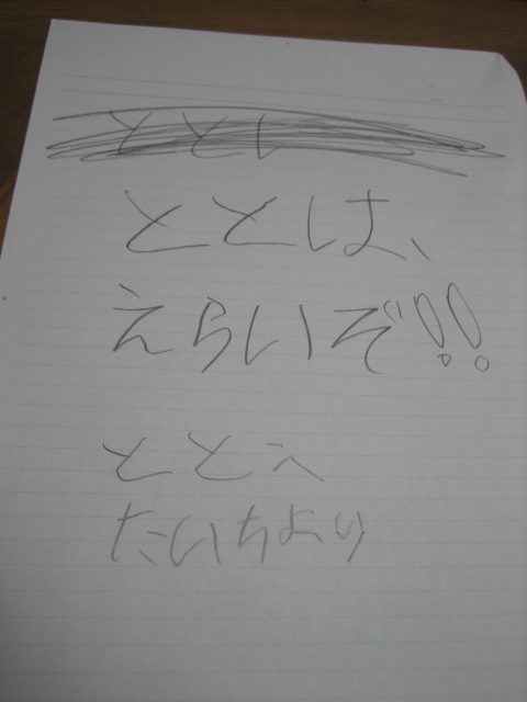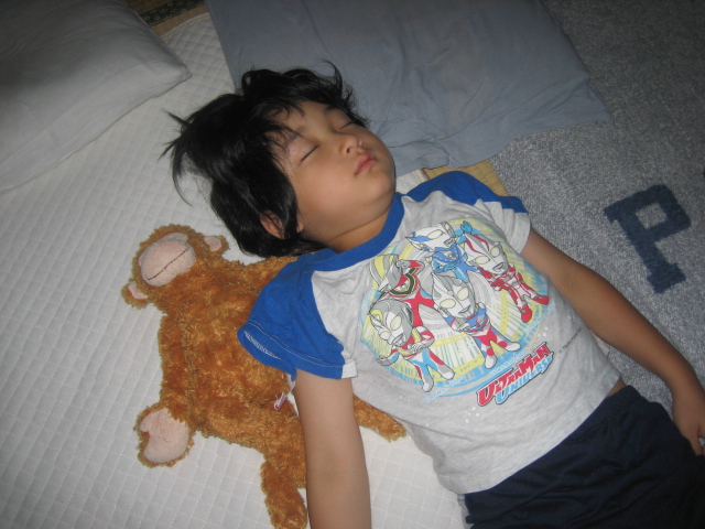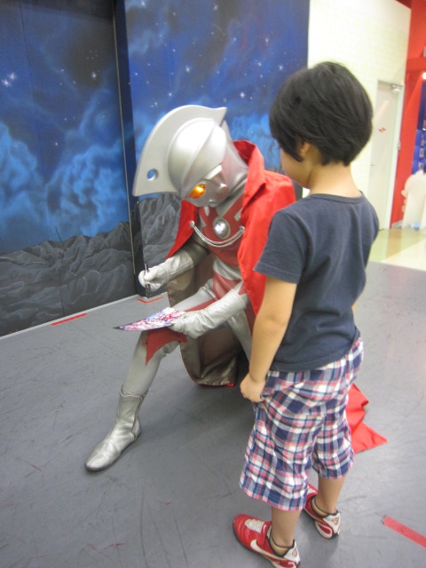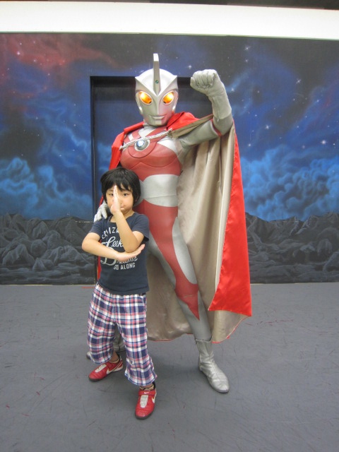 たいちさんも、マンマのご飯が恋しかろうが、親父の手料理を「おいしい」と気遣うだけの心のヒダを見せている。 連休中に、少しはたいちさんにも楽しい行楽を思い、車を走らせ、手取フィッシュランドに向かった。そこにはウルトラマンスタジアムがある。つよいとはやさしいことだ。7歳になった今もまだウルトラの心を忘れない我が子へのご褒美だ。 本日は、エースの登場。 エースを我が家では観音様と呼ぶ。たいちさんも、登場一番に観音様ぁと叫んだ。 エースの直筆サインがもらえるという下敷きを事前に購入し、緊張気味にエースにサインをもらうたいちさん。「直筆」というのは、大人の冷めた思考にはちょっと複雑な構図だが、たいちさんはウルトラ・サインに鼻の下を伸ばす。 最後は記念撮影。照れていたたいちさんも、ここぞとばかり決め技をばっちり。 ウルトラ・パワーステージを観劇。幼稚園児ばかり目立つ観客の中にあって、ウルトラの心を忘れないとはこういうことよと叫んでいるかのように、最前列でウルトラの戦士たちを応援したたいちさんでした。 いつまでもウルトラの心を忘れない子でありますように。 手取フィッシュランドに、さなりも駆けつけてくれ、太地と手取川河口の公園で久しぶりに子供らしい遊びを満喫。さなり、ありがとう。たいちさんはなんとやさしい人たちに守られているのでしょうか。 おやすみは、親父の歌を聴きながら、おさるのジョージとともに。 |